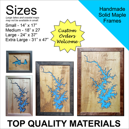 This is a beautiful, detailed, laser engraved and precision cut map, including lake information such as surface area, elevation and maximum depth.