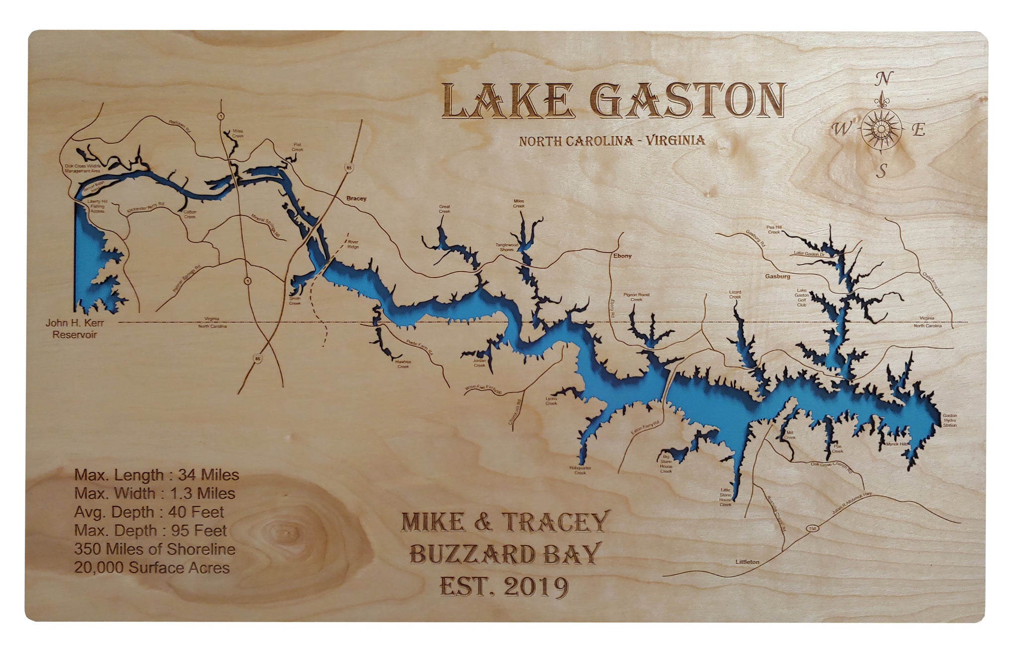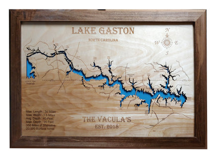 This is a beautiful, detailed, laser engraved and precision cut map, including lake information such as surface area, elevation and maximum depth.
