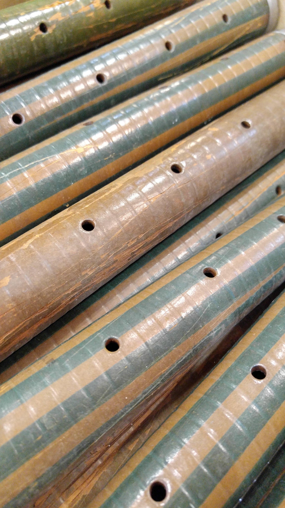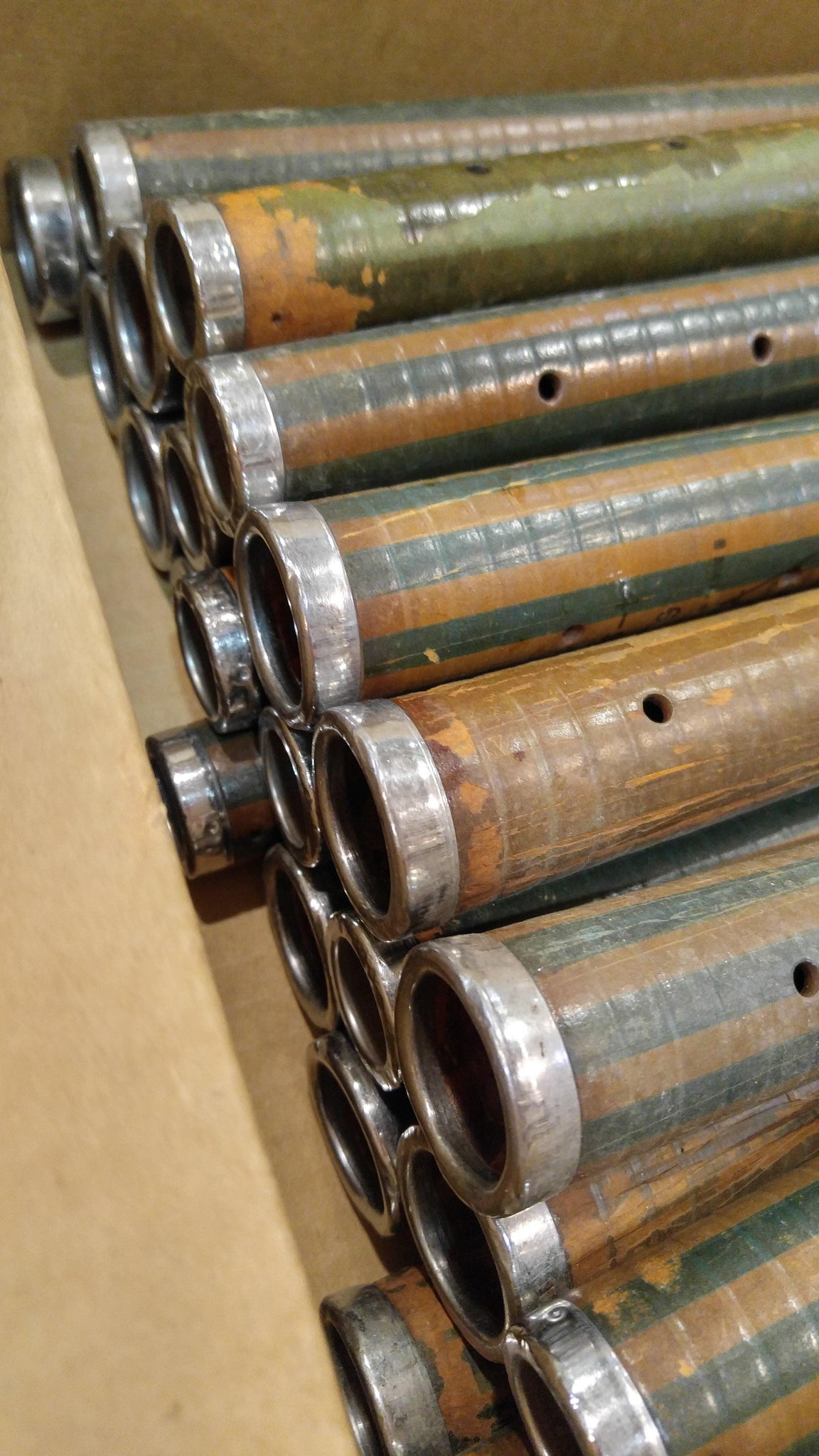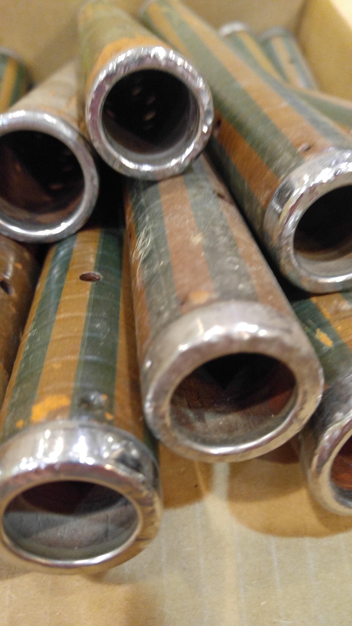 Vintage textile mill spinning bobbins measuring approximately 11" x 1.25". Made of very dense, heavy duty, compressed cardboard with aluminum rings on the ends. Recycled from an old cotton mill. Sold in bundles of 24 pieces.