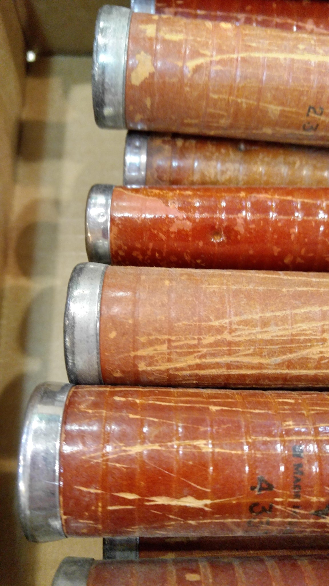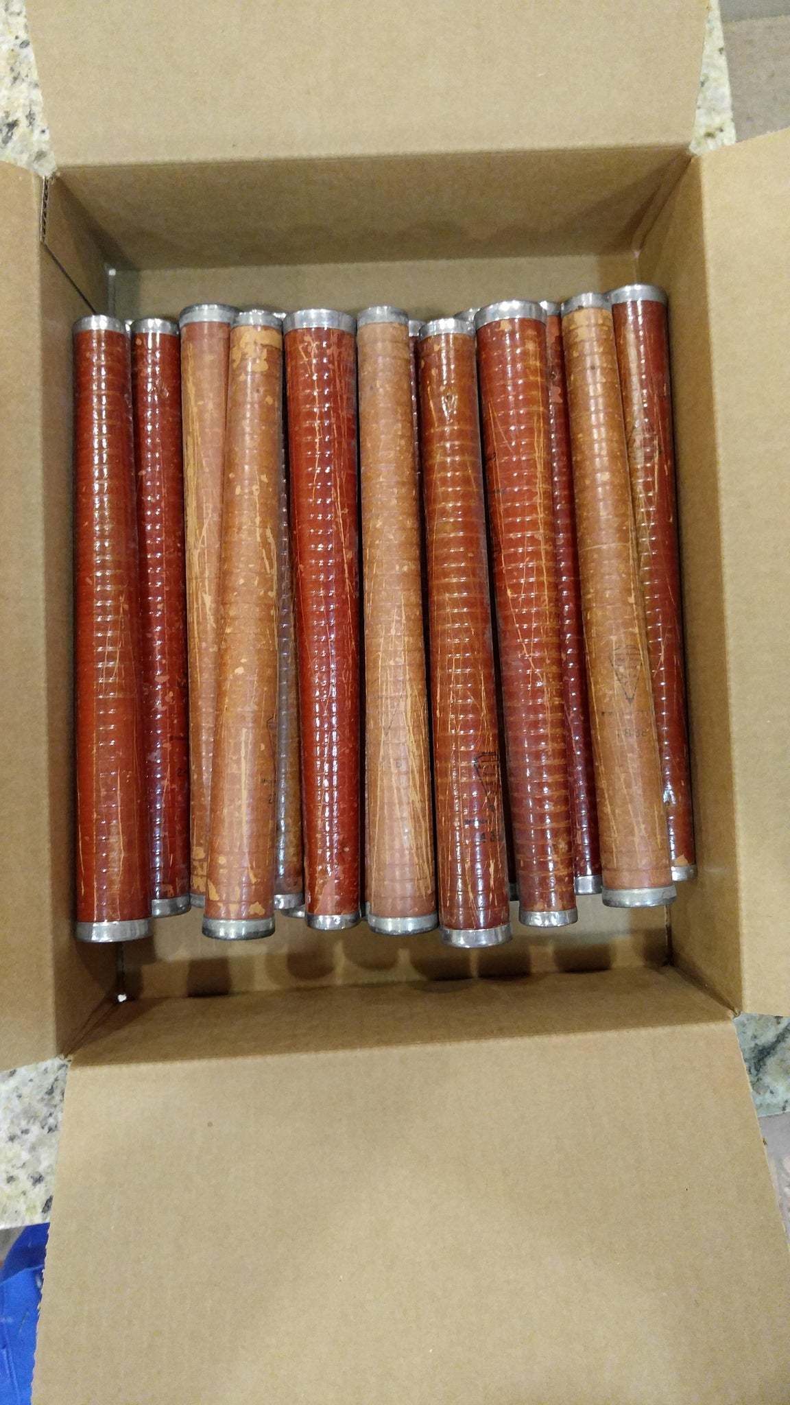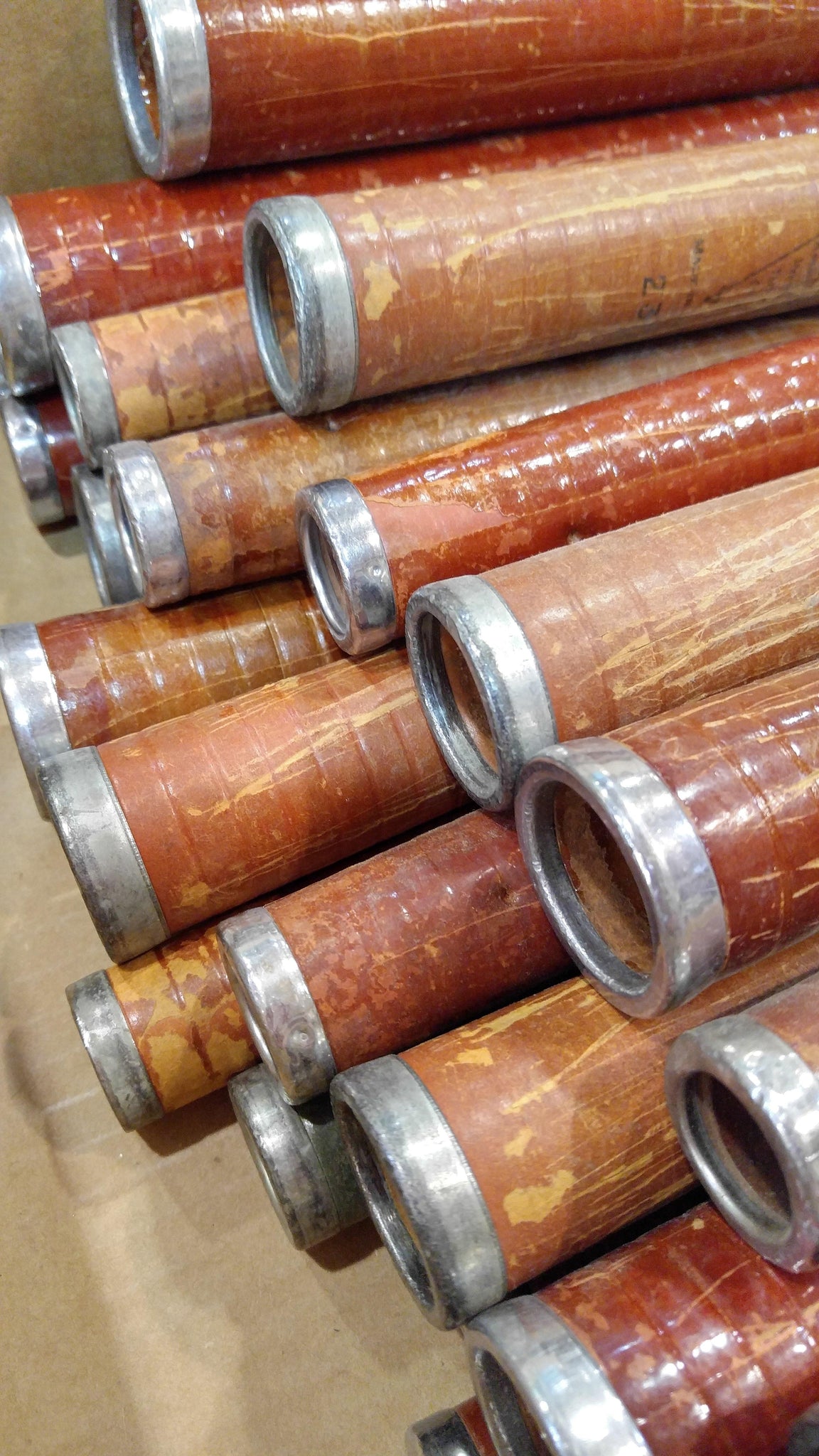 Vintage textile mill spinning bobbins measuring approximately 12" x 1.5". Made of very dense, heavy duty, compressed cardboard with aluminum rings on the ends. Recycled from an old cotton mill. Sold in bundles of 24 pieces.