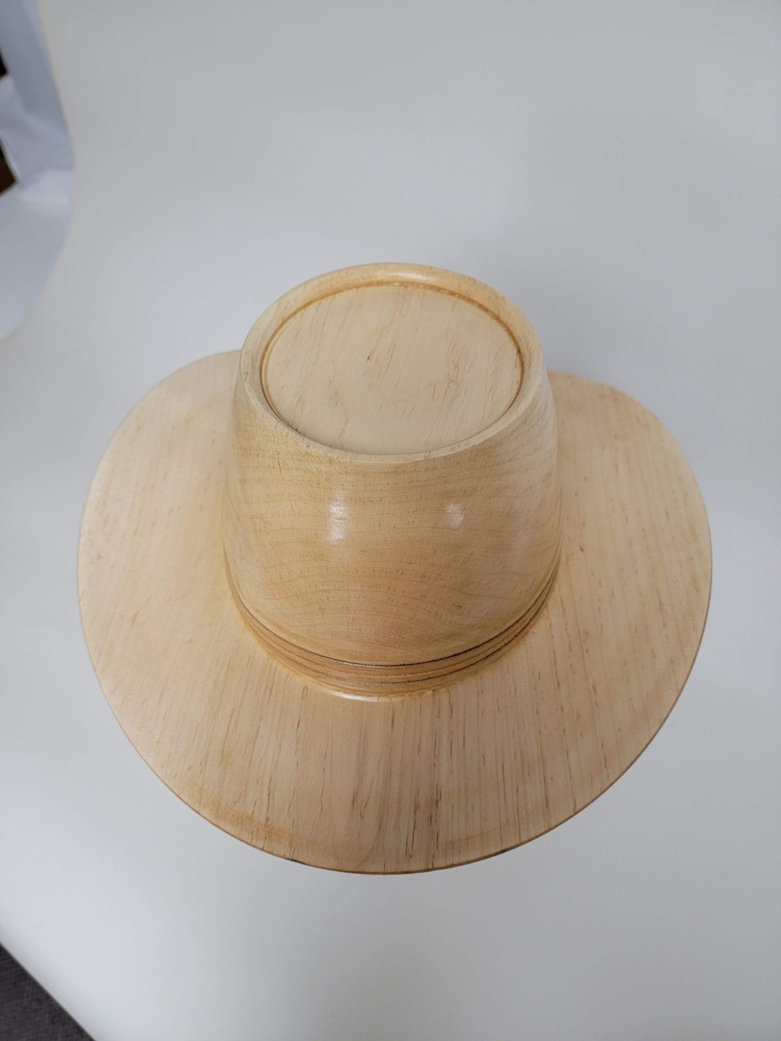 Beautiful wood-turned hat made from Ambrosia Maple signed and numbered by the artist, Brian Butler. Make a fashion statement in this unique hat!