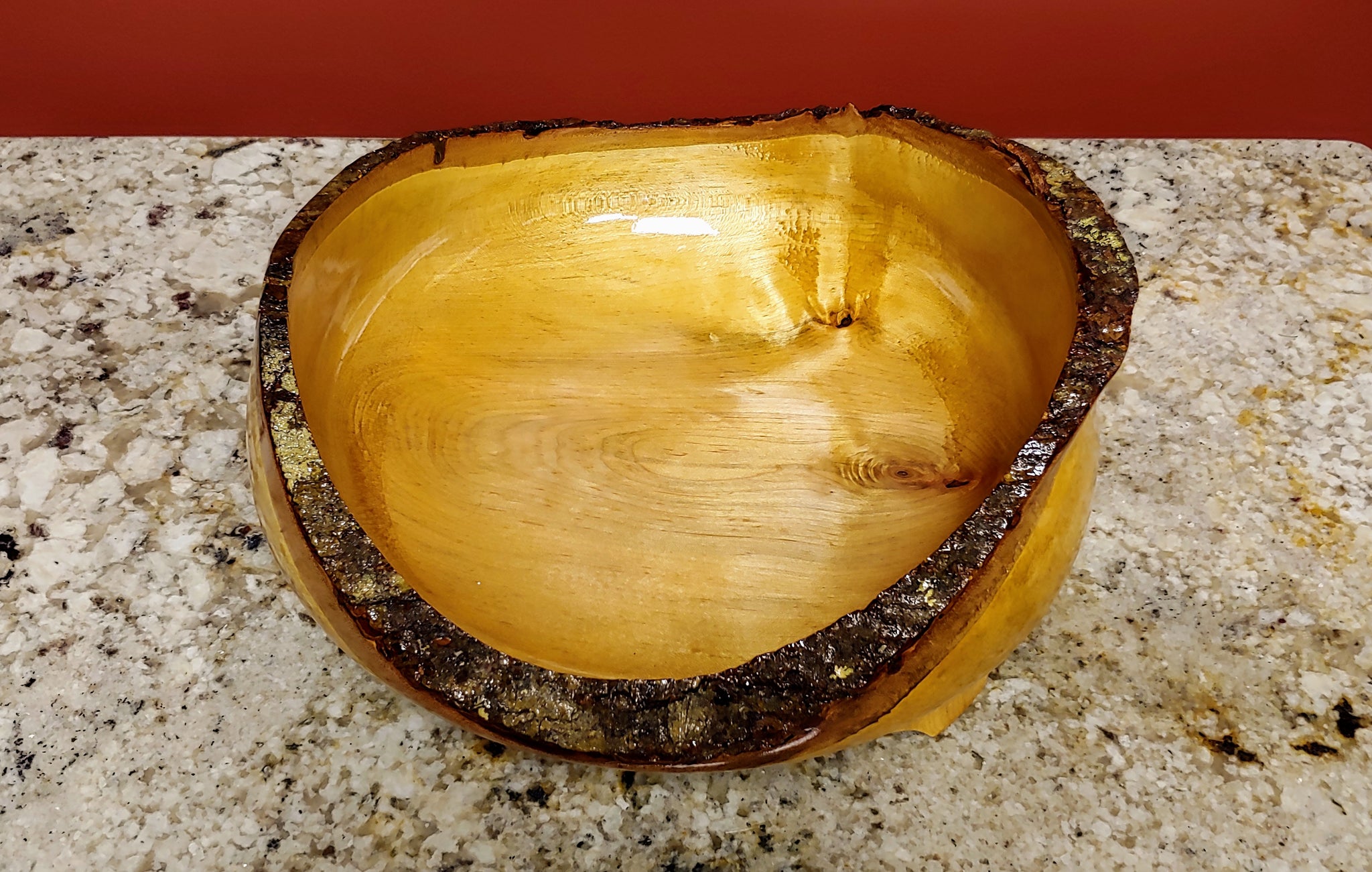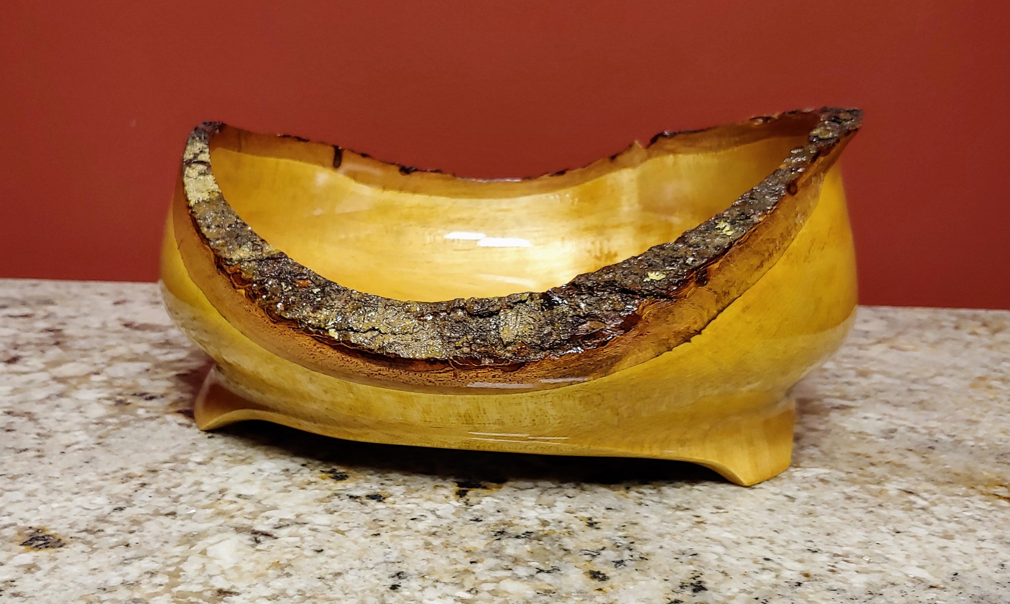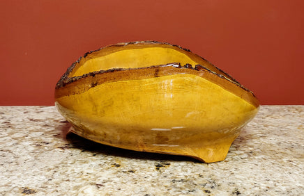 This is a hand turned bowl with raised ends made from maple wood with beautiful color variations with natural edges. It measures 11.5" long, 11.5" wide and had a height of 5.0". Artist Credit: Brian & Linda Butler