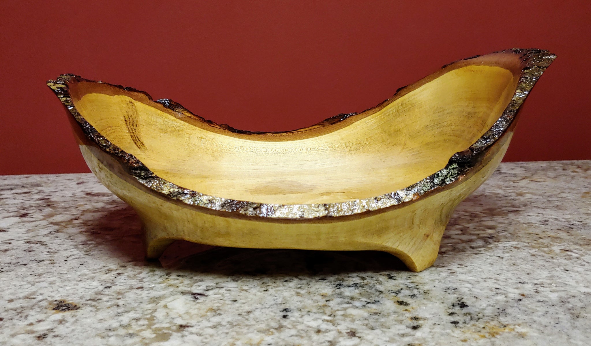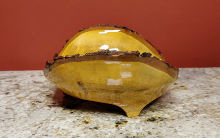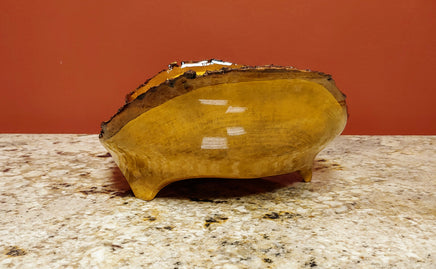 This is a hand turned bowl with raised ends made from maple wood with beautiful color variations with natural edges. It measures 13" long, 9.5" wide and had a height of 4.5". Artist Credit: Brian & Linda Butler