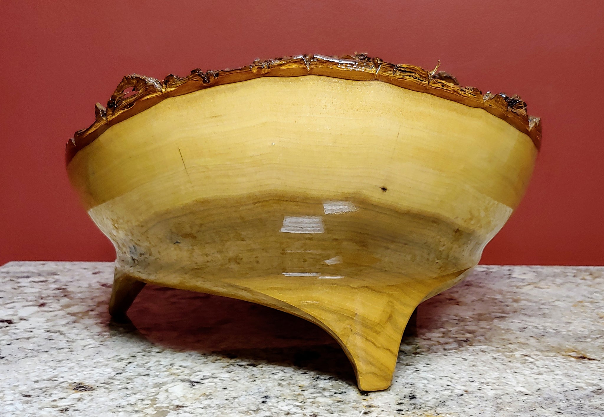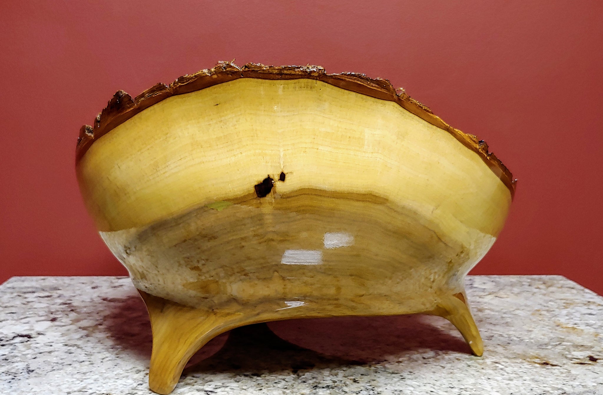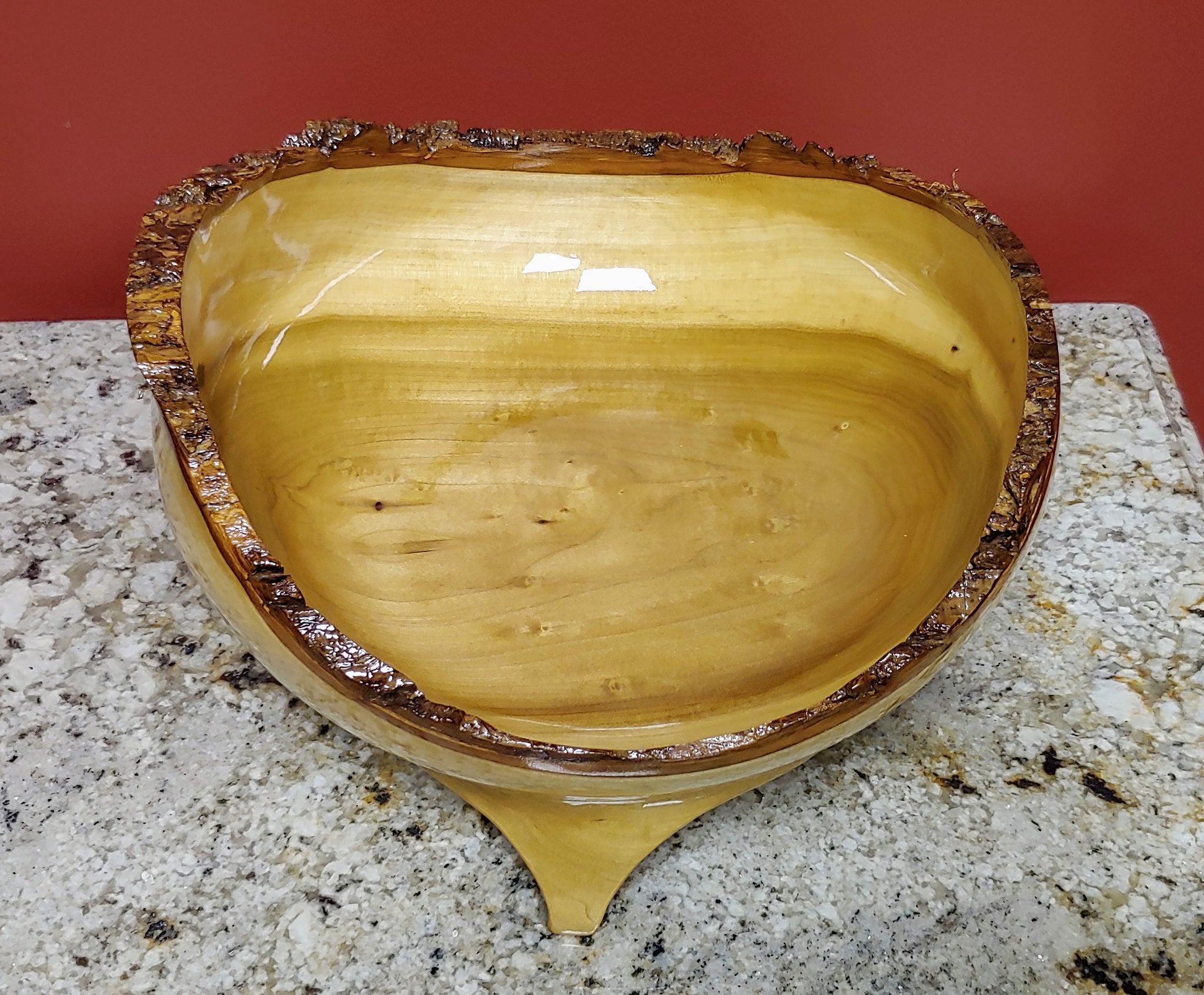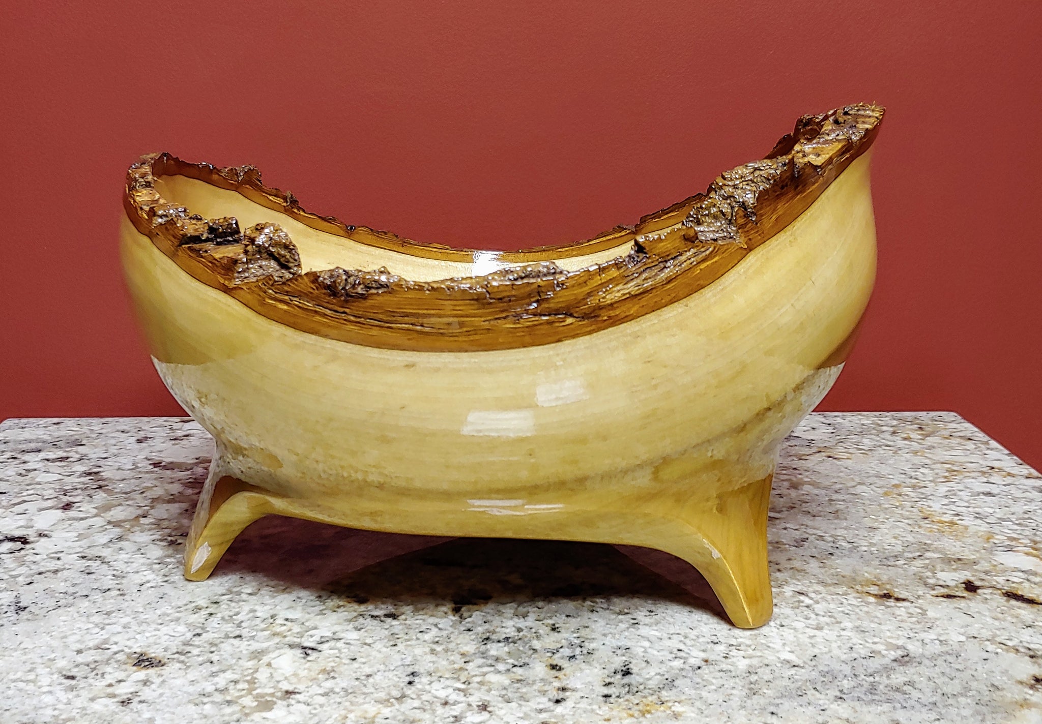 This is a hand turned bowl with raised ends made from poplar wood with beautiful color variations with natural edges. It measures 14.5" long, 14.5" wide and had a height of 9.0". Artist Credit: Brian & Linda Butler
