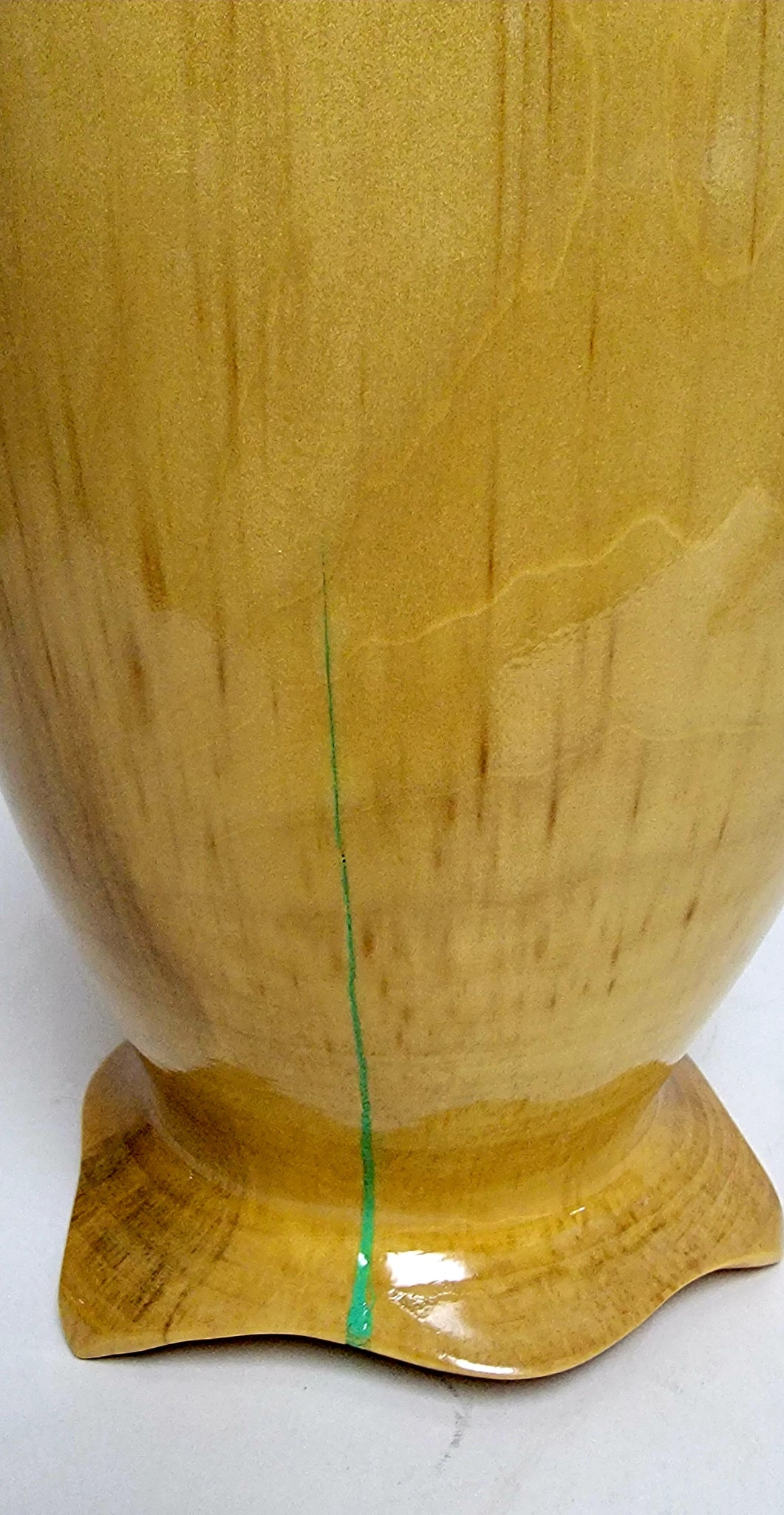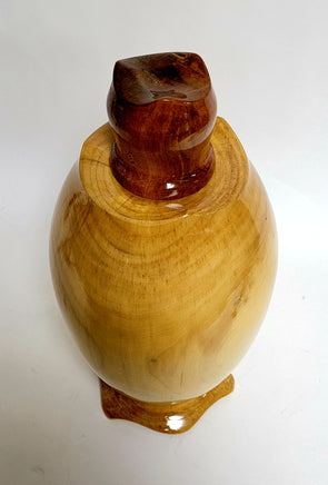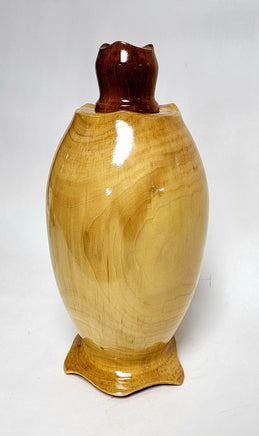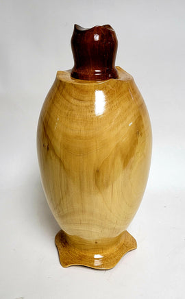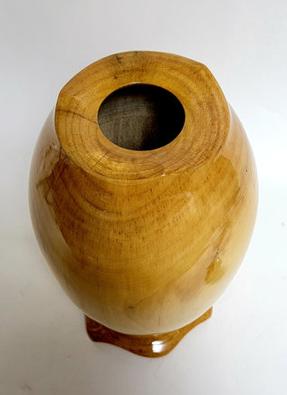 This is a beautifully crafted, hand turned cremation urn made of Poplar Wood with a Ambrosia Maple top. It measures 15" tall & 23.5" round at it's widest point.